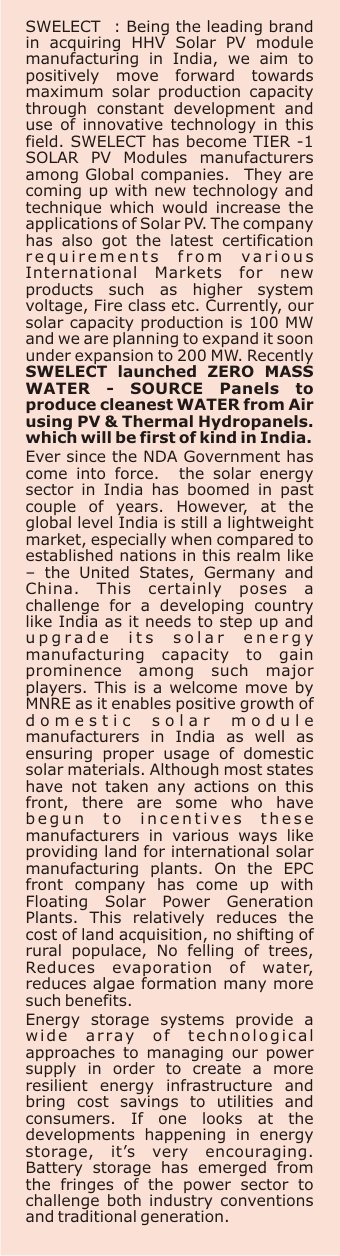 installations to its credit. The company has acquired HHV Solar, a reputed SPV