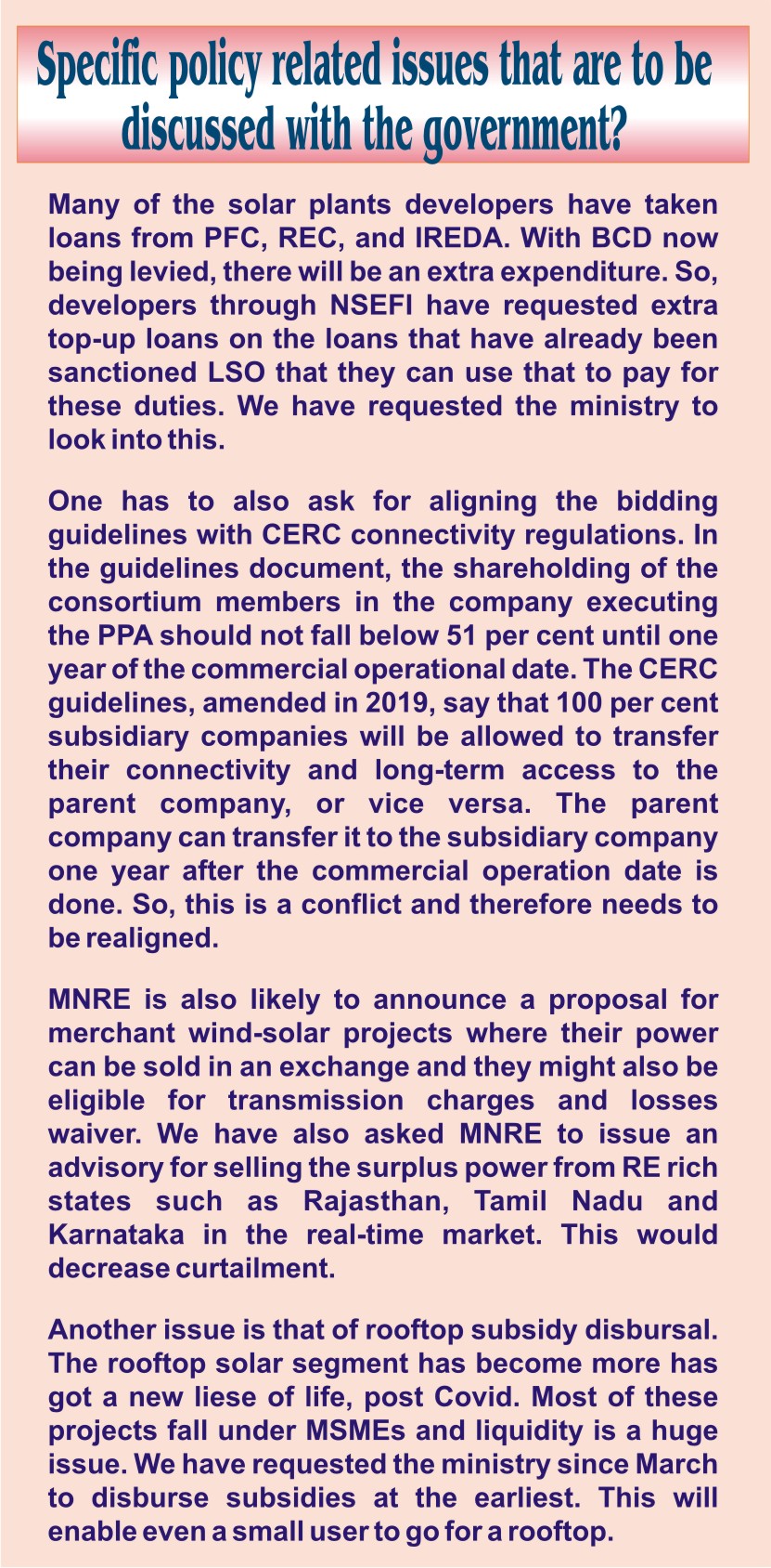 concerns (i.e. connection to the national grid)," said Salil Chatterjee, head,