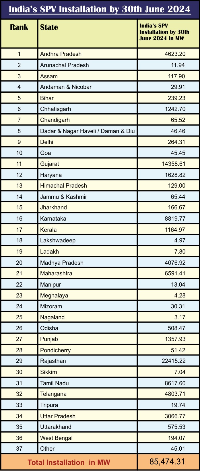 Andhra Pradesh ranks seventh among states with the largest installed solar